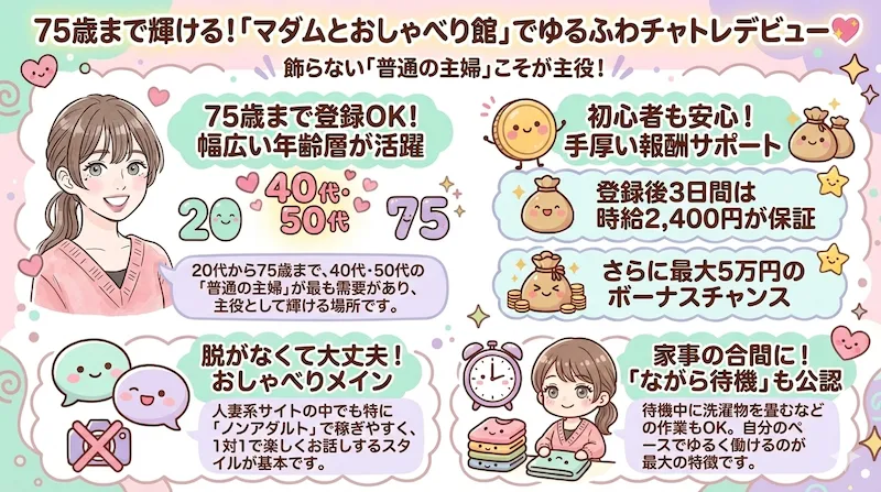 - 75歳まで登録可能で特典最大53,000円の「マダムとおしゃべり館」