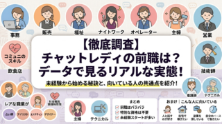 チャトレメルレ全般 チャットレディの前職は?リアルなデータから見る意外な経歴とは 「チャットレディってどんな人がやってるの?」「未経験でもできるの?」こういった疑問を持っている方に向けて、実際のデータをもとにチャットレディの前職(現職)をまとめました。結論から言うと、かなり幅広くて「特別な経験は不要」です。 2026.04.09 チャトレメルレ全般基本情報