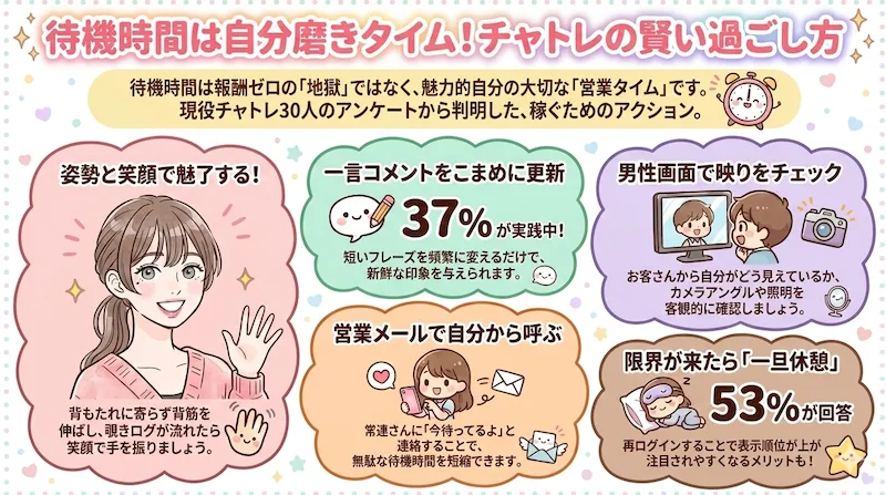 待機中は一見無駄な時間のように思えますが、実は非常に重要な時間です。この時間をどう活用するかが、チャットレディとしての成功に直結します。