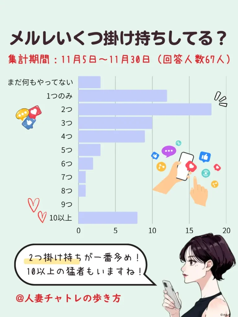メルレ担当のちゅうかです。メルレのお部屋では、メルレをいくつ掛け持ちしているかについて聞いてみました!144人の方から回答がいただけましたよ!