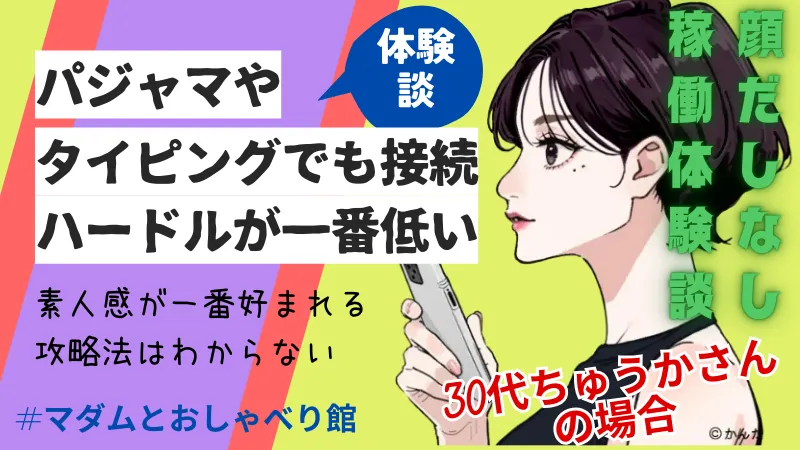 マダムとおしゃべり館はノンアダルトでもつながること、おしゃべりのみ、顔出しなしでも稼働しやすいという評判も聞いていたので登録してみました。