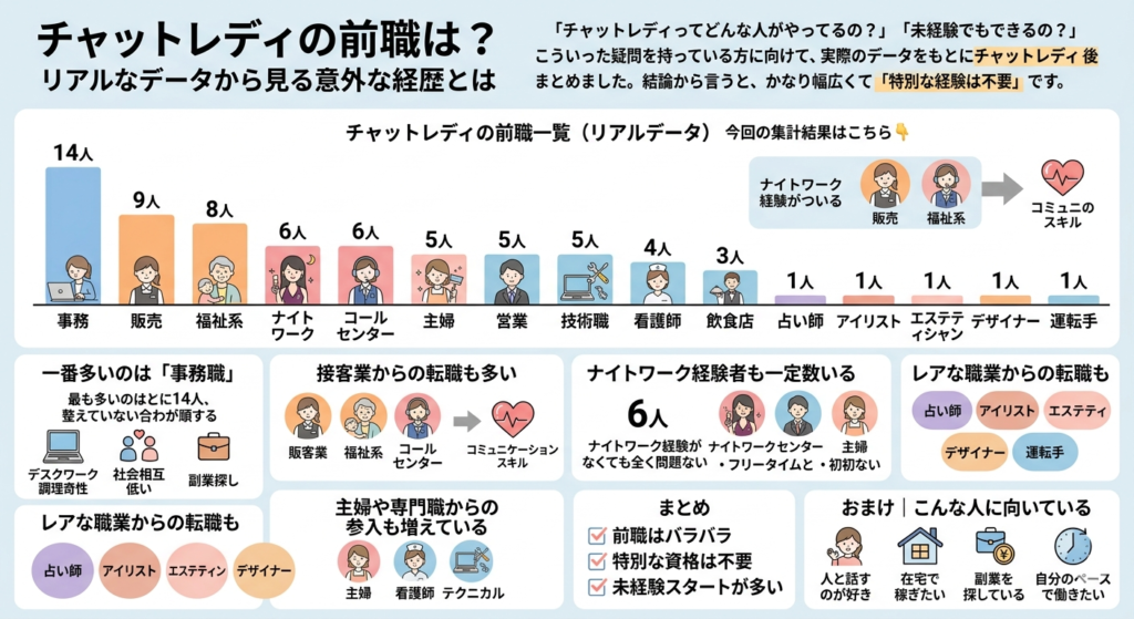 こういった疑問を持っている方に向けて、実際のデータをもとにチャットレディの前職(現職)をまとめました。