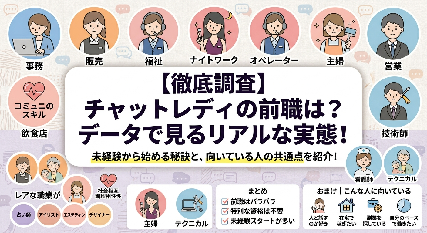 こういった疑問を持っている方に向けて、実際のデータをもとにチャットレディの前職(現職)をまとめました。