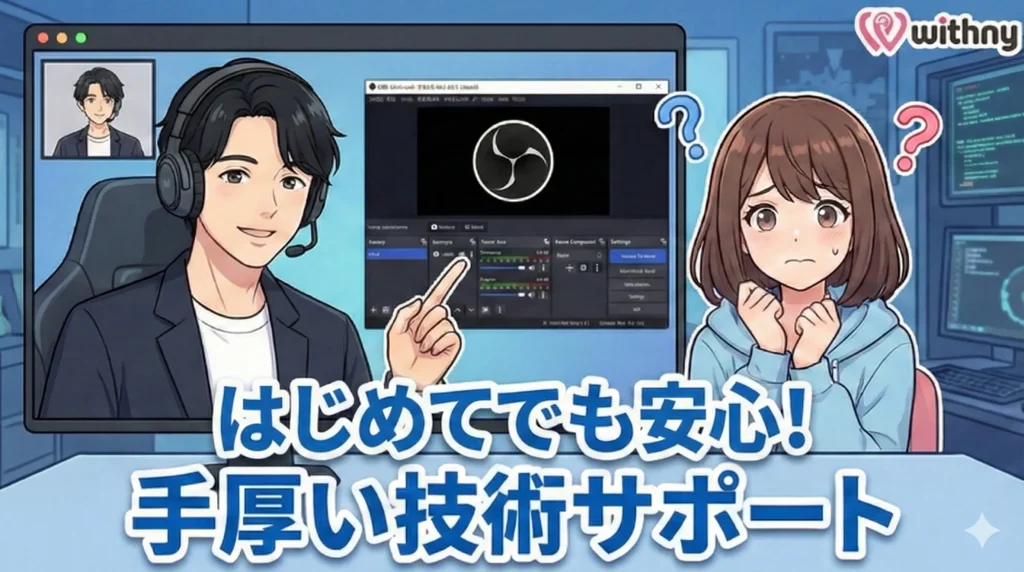 ウィズニーはOBSの設定とか、機材の準備とか、初心者には難しいイメージがあります。機材に詳しくないし、配信未経験の私でも大丈夫ですか…?