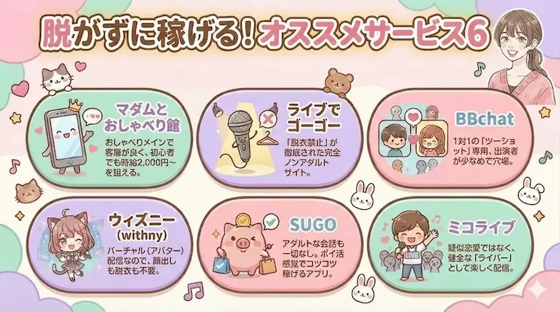 チャトレよりも稼ぐのは難しくなりますが、絶対に脱ぎたくない・アダルトも嫌!という方には以下のような選択肢もありますよ!