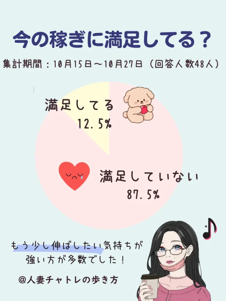 次に、今の稼ぎに満足しているかについて聞いてみました!48人の方が回答してくれましたよ!